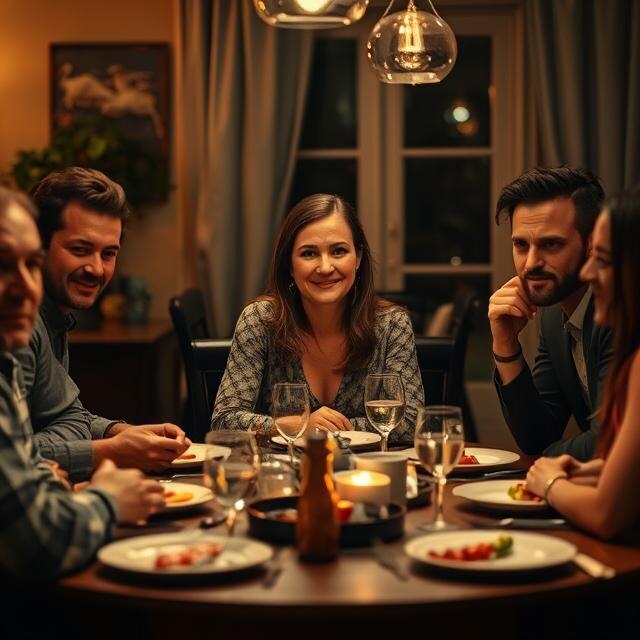 Когда на стол подают угощения, кто-то, возможно, ожидает теплого слова в ответ, но смех от шуток незнакомца перекрывает индивидуальные исторические моменты. "Лучше бы обошелся без подколов", — подумает кто-то из гостей. Кажется, что этот вечер относится к каждому, но слова, превращающие личное в публичное, создают напряжение.