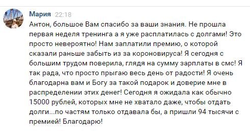 Мария, участница тренинга Антона Сочешкова по Духовной Экономике, испытала настоящую перемену в своей жизни. Она получила возможность избавиться от долгов, благодаря внезапным и неожиданным доходам. В её случае одно обучение стало поворотным моментом.