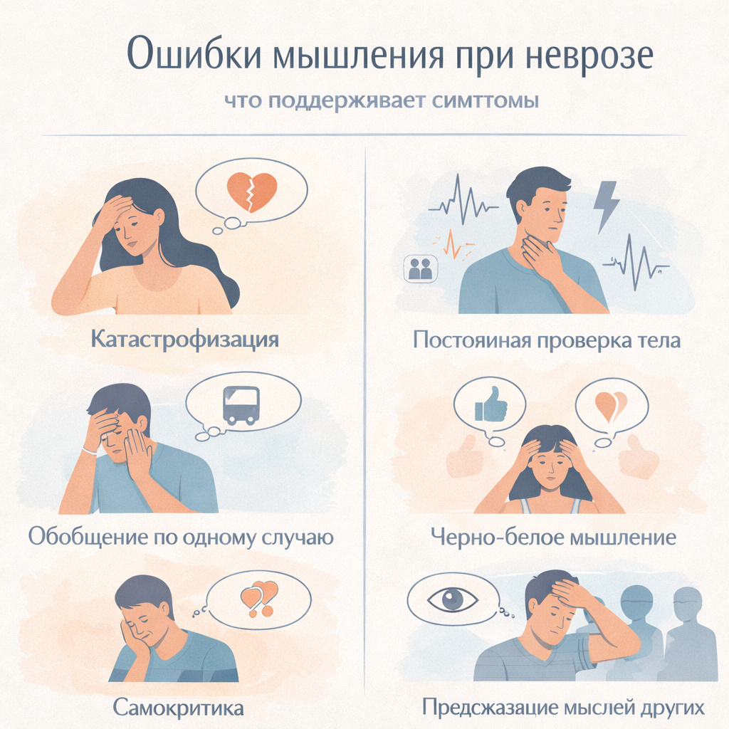 Ниже представлены наиболее распространенные ошибки мышления, наблюдаемые у людей с невротическими расстройствами.