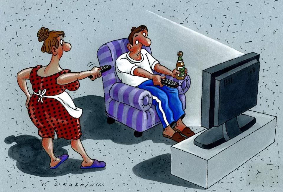 Юмор о супружеской жизни зачастую становится банальным и избитым, но карикатуры Валентина Дружинина вдохновляют на размышления. Его творчество не направлено на то, чтобы высмеивать, а скорее служит способом осмыслить повседневность. Дружинин замечает необычные связи между людьми, которые живут под одной крышей, показывая, насколько натянуто может быть такое общение.