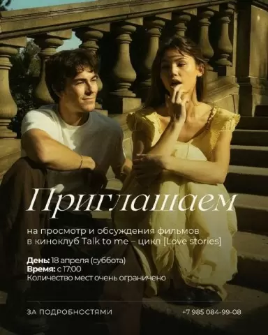 Киноклуб Talk to me — это не просто просмотр фильмов. Это уникальная возможность обратиться к собственному опыту через призму кино. Зрители обсуждают, как истории на экране помогают выявить то, что часто остается незамеченным в повседневной жизни. Вместе участники смогут проанализировать, что каждый ищет в любви, и почему это чувство порой оказывается сложнее, чем кажется на первый взгляд.