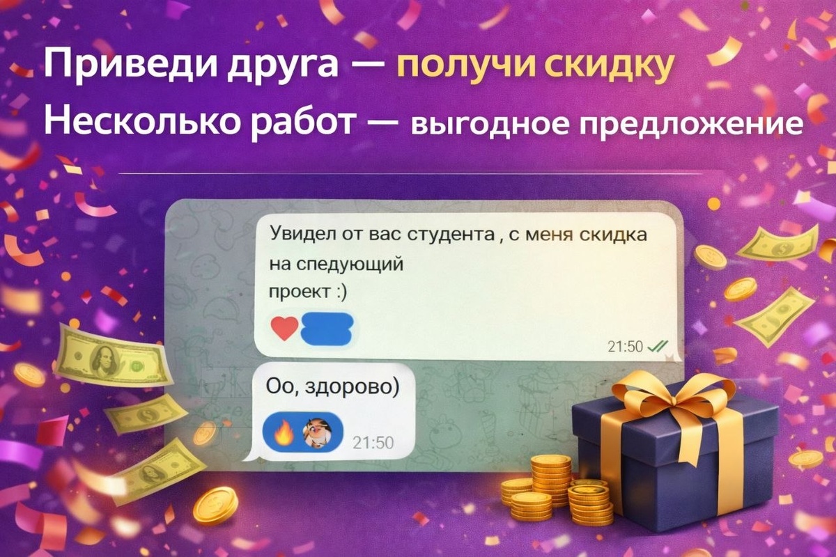 - Закажите несколько работ: При заказе двух и более работ вы automaticamente получаете персональную скидку. Она распространяется на любые виды услуг!