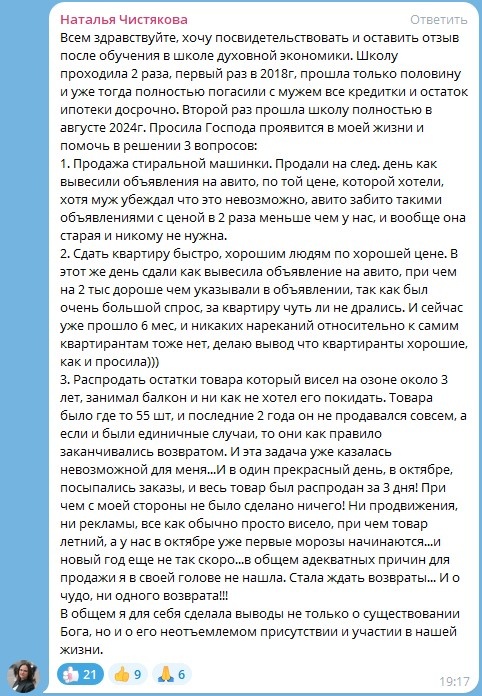 После участия в марафонах, жизнь Ольги резко изменилась. Она отмечает: «Я внезапно получила значительные доходы, и супругу повысили зарплату, чего мы долго ждали». Это были настоящие чудеса, которые трудно объяснить лишь логикой. Ольга уверена: такие изменения — результат Божьей щедрости в ответ на её доверие и шаги веры, проявляющиеся через духовный закон сеяния и жатвы.