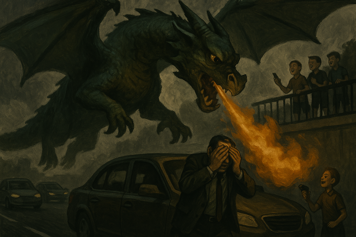 Внезапно один из детей, Вельмут Ханиган, запустил голографического дракона, который невзначай напугал человека. "Так нельзя!" — восклицала Тельма, стремительно покидая площадку, чтобы поймать шалуна.