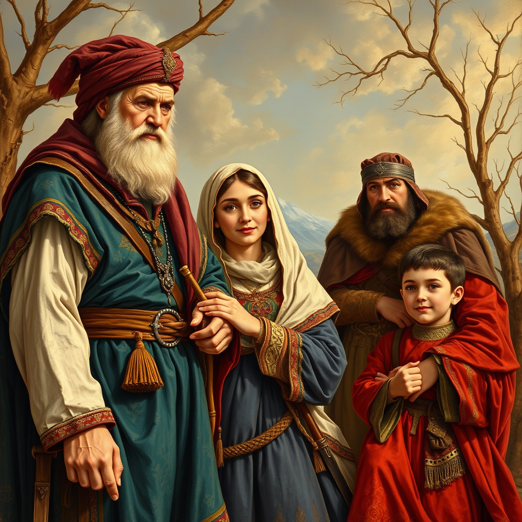В высокогорном ауле, окруженном величественными пиками и зелеными долинами, жила женщина по имени Амина. Её жизнь состояла из четырех драгоценных камней: мудрый отец Аслан, вспыльчивый брат Заур, заботливый муж Мурат и юный сын Тимур.