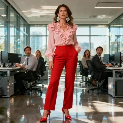 В понедельник, вооружившись подготовленным образом, сотрудница пришла в офис в ярко-красных брюках, блузке с рюшами и колготках в сеточку. На её ногах были красные каблуки, а на руках – массивные украшения с стразами. Реакция коллег была неожиданной: все присутствующие ахнули, а офис превратился в карнавальное зрелище, когда другие сотрудники начали следовать её примеру и выражать своё недовольство через креативные наряды.
